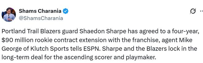 杨瀚森的两位队友都在北京时间10月20日成功续约。据经纪人戴夫-普特里向ESPN透露,波特兰开拓者队前锋塔马尼-卡马拉已与球队达成一份为期四年、总金额8200万美元的续约合同。另据Klutch体育经纪公司的经纪人迈克-乔治向ESPN透露,波特兰开拓者队后卫谢登-夏普已与球队达成一份为期四年、总金额9000万美元的新秀续约合同。